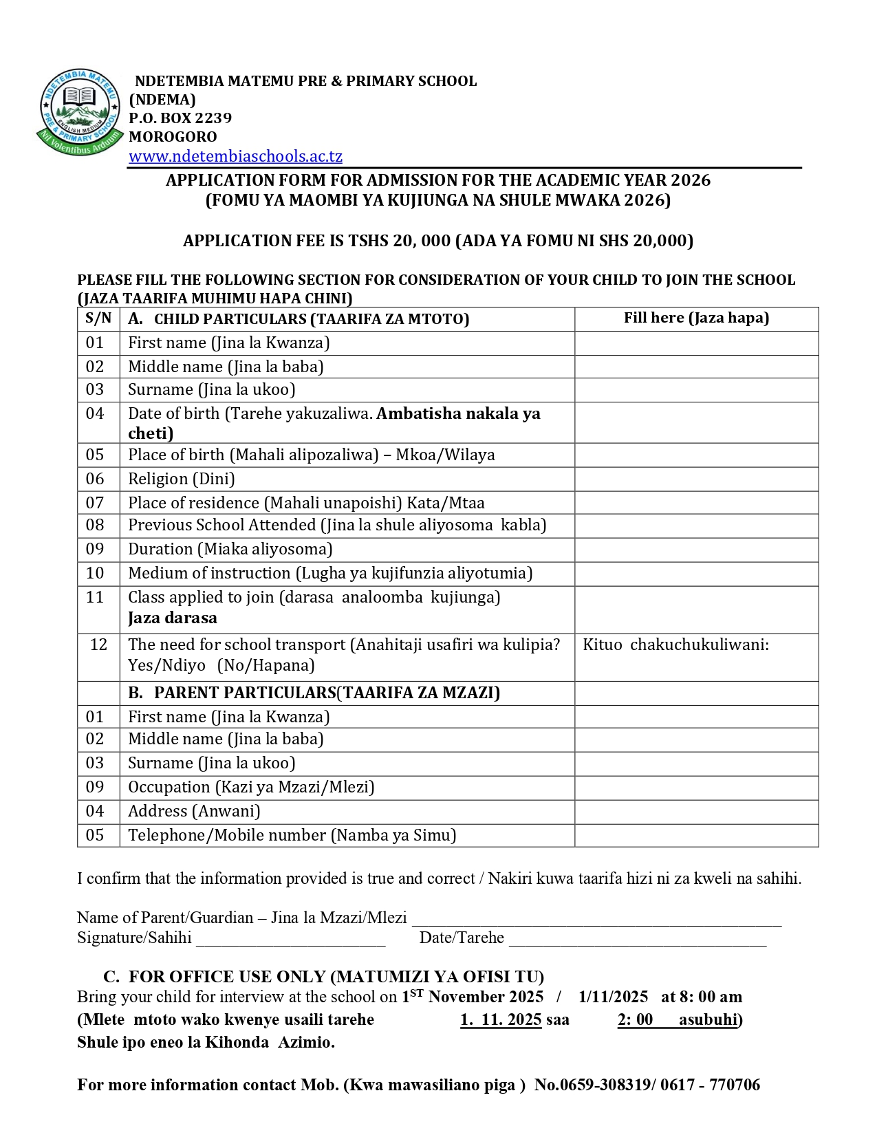 (FOMU YA MAOMBI YA KUJIUNGA NA SHULE MWAKA 2026)